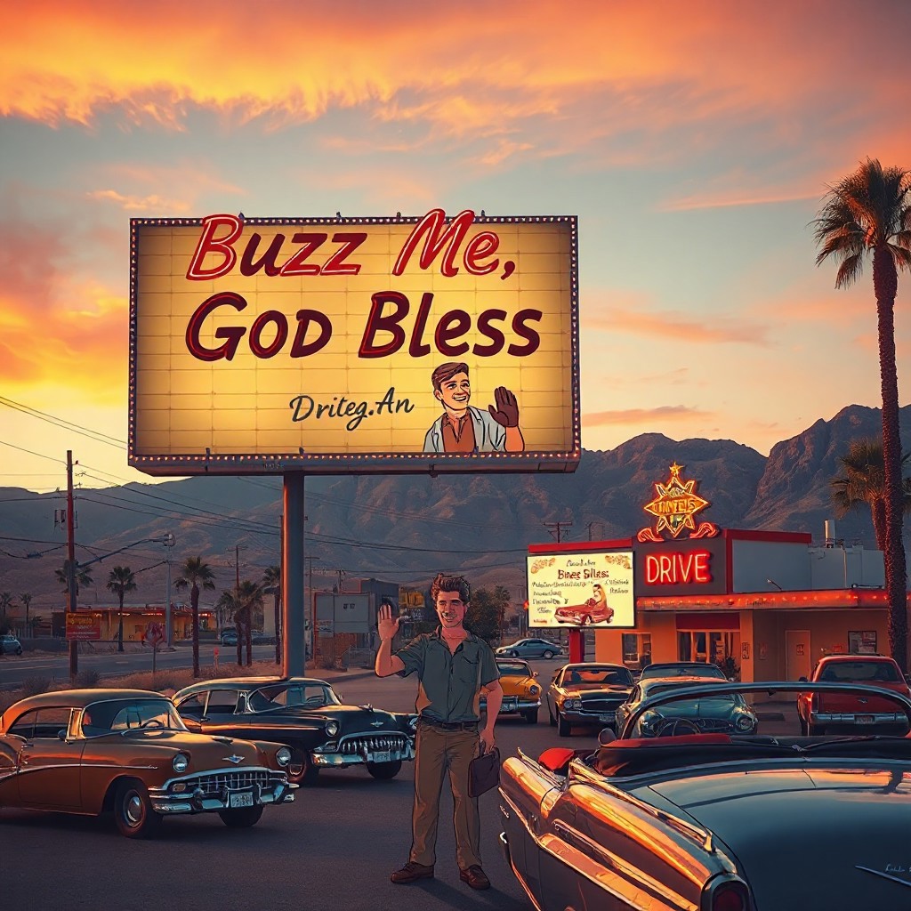 A vintage 1950s Las Vegas scene at sunset, featuring a large retro billboard beside a classic drive-in theater. The billboard is styled with bold, hand-painted lettering and neon lights, displaying the phrase: "Buzz Me, God Bless" in a heartfelt, eye-catching design. Below the text is an illustration of a smiling man in humble clothing, waving gently. The drive-in is filled with classic cars—Chevys, Buicks, and convertibles—with a warm nostalgic glow from neon signs, palm trees, and desert mountains in the background. The overall tone is cinematic, nostalgic, and slightly surreal.