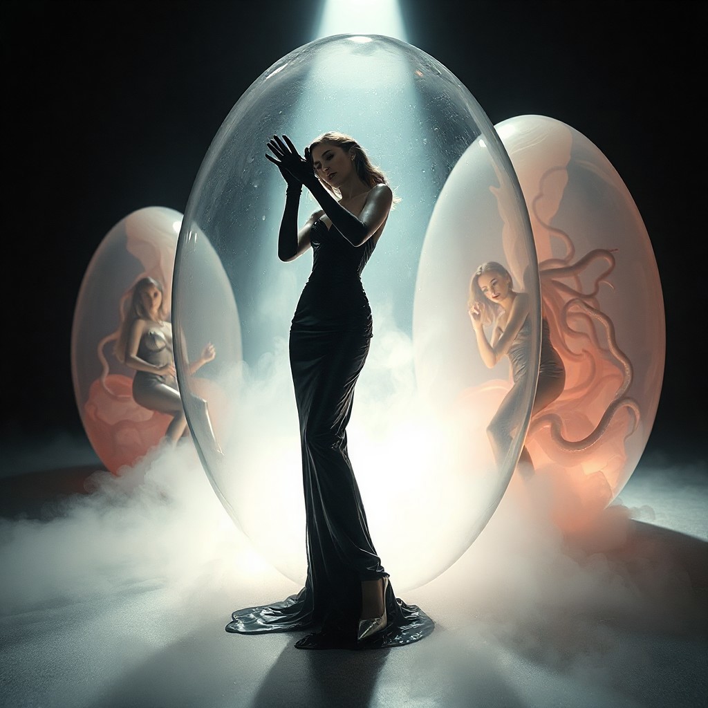 noble norvegian femme fatal lady standing trying to break free from giant transparent slime egg encasement, wearing evening GLOSSY THIN black slime live tentacles gown, GLOVES and high heels, , surrounded by weird fog from the floor, captured in light beam from celling, giant slime covered transparent eggs with encased ladies at background, breeding chamber, ultrathin waisT, HORROR, reminiscent of H.R. Giger, Zdzisław Beksinski, and Ash Thorp's dark, sleek styles, with close-up glamour photography, glossy satin and silver heels glistening, fleshy slime dripping, and dark shadows.