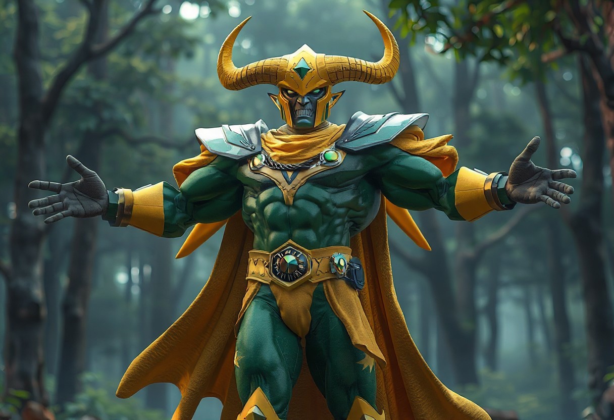 "A hyper-detailed concept art scene featuring the Marvel character Ikonn, the Golem Rock Hammer, standing proudly in a dynamic pose with arms outstretched. Dressed in a vibrant green and yellow suit adorned with a flowing yellow cape, Ikonn's head is crowned with a yellow helmet featuring prominent horns, symbolizing strength and power. Set against a Closed Forest background, the scene highlights the vivid colors and intricate details of Ikonn. Rendered in hyper-realistic 3D with Octane Render, the composition showcases sharp lines, stunning colors, and impeccable balance. Inspired by contemporary aesthetics and Grammer Effect Style, the image conveys vivid emotions and a powerful message. Trending on ArtStation, 4K, ultra-detailed, and impeccably composed."