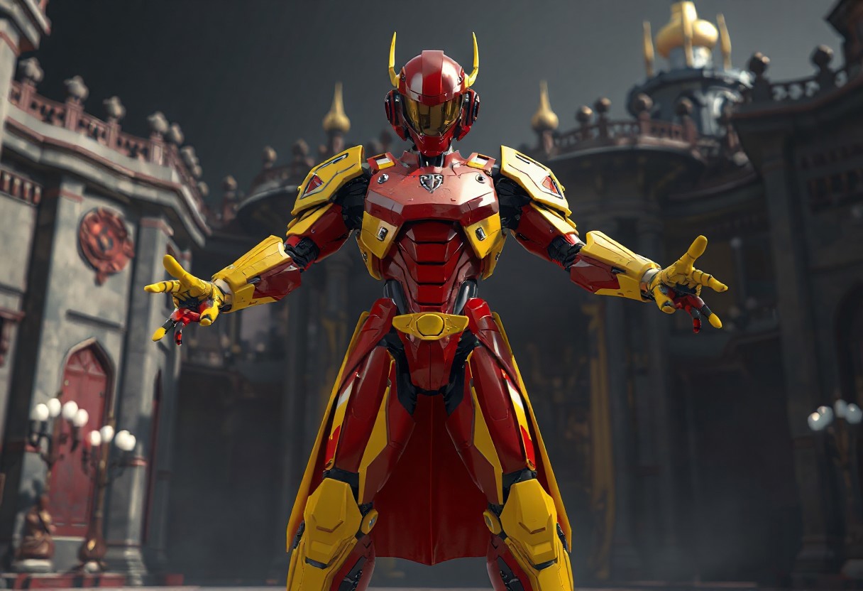 "A high-detail concept art scene featuring a Cyborg Doctor standing confidently against the Zaralaam the Dark Palace background. The Cyborg Doctor is a vibrant mix of red and yellow, with a red helmet featuring a yellow visor. The body is predominantly red, adorned with yellow accents, while the arms and legs are bright yellow, matching the visor. The Cyborg Doctor's arms are outstretched, and its legs are slightly spread, conveying readiness and dynamism. The composition is minimalist, with the Cyborg Doctor as the focal point, drawing the viewer's attention. Rendered in hyper-realistic 3D with Octane Render, the scene showcases lifelike details, sharp lines, and stunning colors. Inspired by contemporary aesthetics and Grammer Effect Style, the image conveys vivid emotions and a powerful message. Trending on ArtStation, 4K, ultra-detailed, and impeccably composed."