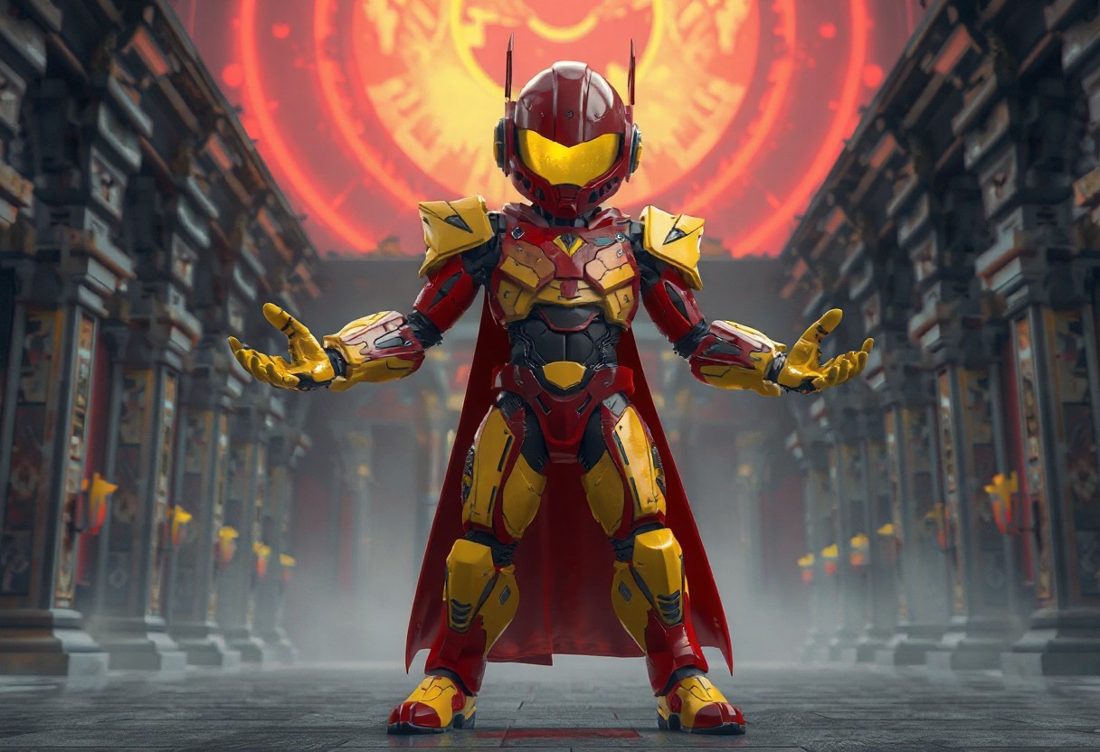 "A high-detail concept art scene featuring a Cyborg Doctor standing confidently against the Zaralaam the Dark Palace background. The Cyborg Doctor is a vibrant mix of red and yellow, with a red helmet featuring a yellow visor. The body is predominantly red, adorned with yellow accents, while the arms and legs are bright yellow, matching the visor. The Cyborg Doctor's arms are outstretched, and its legs are slightly spread, conveying readiness and dynamism. The composition is minimalist, with the Cyborg Doctor as the focal point, drawing the viewer's attention. Rendered in hyper-realistic 3D with Octane Render, the scene showcases lifelike details, sharp lines, and stunning colors. Inspired by contemporary aesthetics and Grammer Effect Style, the image conveys vivid emotions and a powerful message. Trending on ArtStation, 4K, ultra-detailed, and impeccably composed."