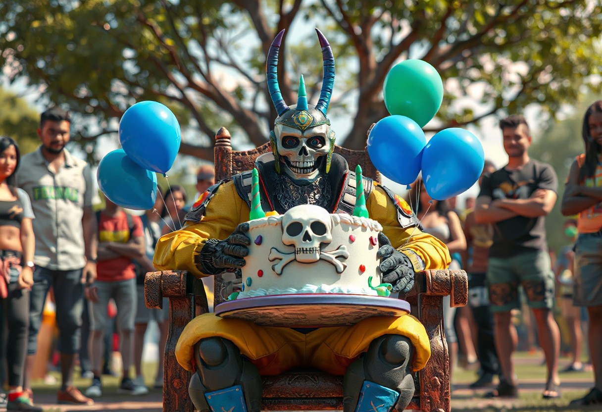 "A vibrant concept art scene of a Super Soldier Soul seated on a chair, holding a cake adorned with a skull-and-crossbones design. Surrounding him, a group of people stand, adding a lively and joyful atmosphere. The cake is decorated with blue and green balloons, enhancing the festive vibe. The setting is outdoors, with a tree in the background, creating a casual and joyful environment. Rendered in hyper-realistic 3D with Octane Render, featuring lifelike details, sharp lines, and stunning colors. The composition is balanced, with intentional focus on the Super Soldier Soul and the cake. Inspired by contemporary aesthetics and Grammer Effect Style, the scene conveys vivid emotions and a powerful message. Trending on ArtStation, 8K, ultra-detailed, and impeccably composed."