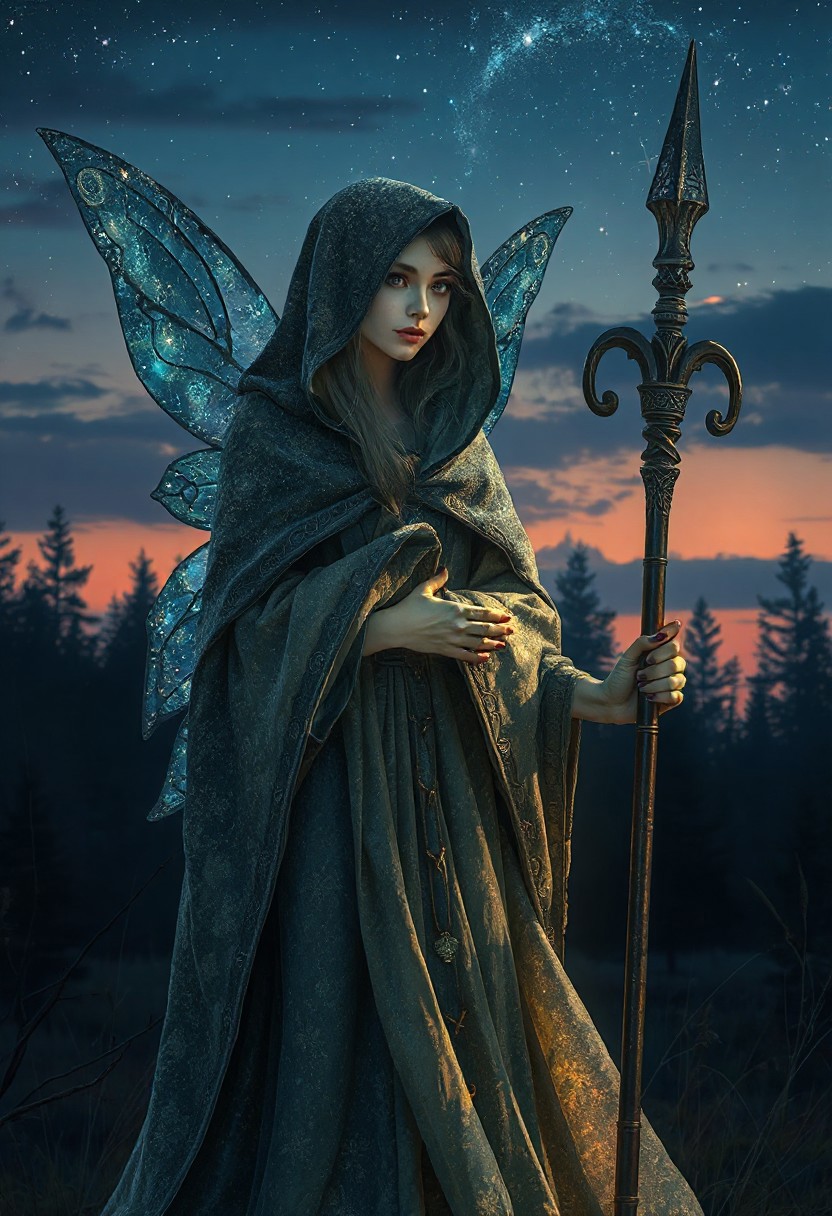 A mystical fairystands alone beneath a twilight sky, cloaked in a robe that shimmers with stardust. Her eyes glow faintly like distant galaxies, and a serene, knowing smile plays on her lips. Ancient runes faintly pulse along his staff, and the wind seems to whisper secrets around him. The forest behind her is alive with quiet magic, and the air shimmers with otherworldly energy.
