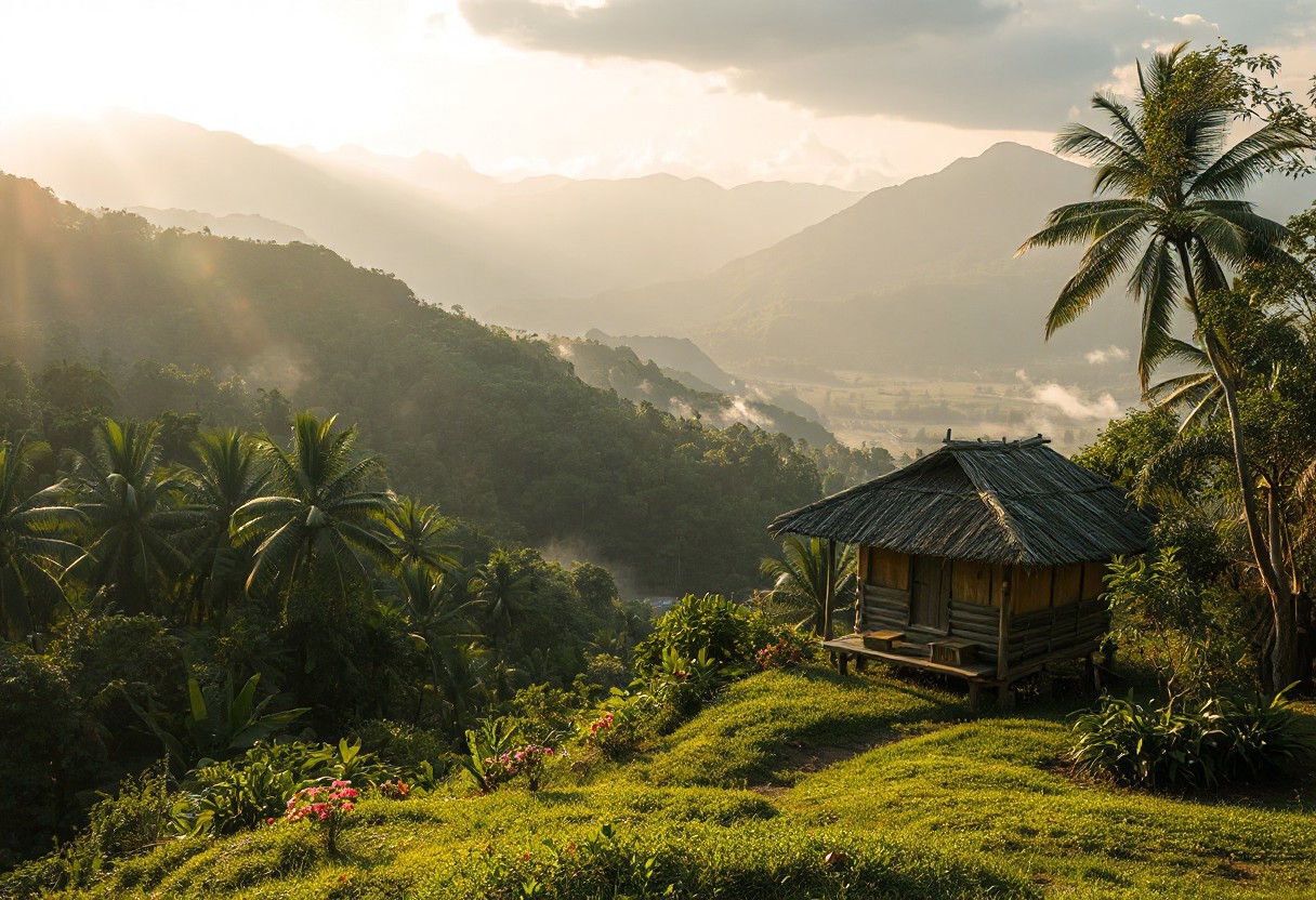 A serene, picturesque valley in the Philippines with lush greenery, gentle sunlight filtering through tropical trees. A traditional Nipa hut (Filipino bahay kubo) sits peacefully on a hilltop or slope, overlooking a majestic mountain range in the background. The hut is made of bamboo and thatched palm leaves, surrounded by vibrant flowers and native vegetation. Mist rises gently from the valley below. Soft golden-hour lighting enhances the tranquil atmosphere. Realistic, high detail, cinematic quality.