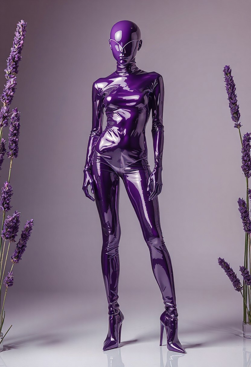 abstract model in latex shiny full body outfit avant-garde style with lavender bold Color Scheme