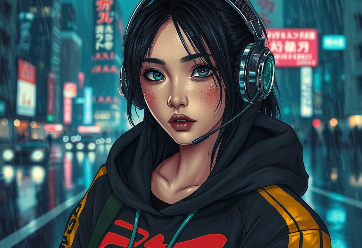 Half-Japanese female hacker. More Caucasian with freckled nose and cheeks. Teal lipstick. Aged 28. Cyberpunk clothing. Hi tech chrome and carbon fibre one eared headset. Bold graphic styled Hoodie with Japanese lettering down a sleeve and a bold golden stripe down each sleeve The girls eye pupils have swirling Galaxy of stars and specks floating in a nebula pattern Posed in front of a Rainy city at nite