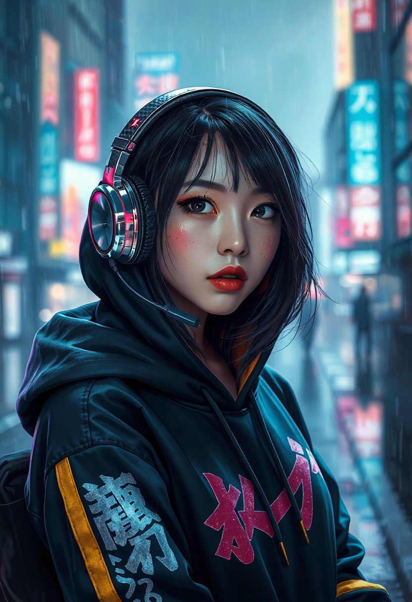 A 4K photorealistic picture of a Half-Japanese female hacker. More Caucasian with freckled nose and cheeks. Teal lipstick. Aged 28. Cyberpunk clothing. Hi tech chrome and carbon fibre one eared headset. Bold graphic styled Hoodie with Japanese lettering down a sleeve and a bold golden stripe down each sleeve The girls eye pupils have swirling Galaxy of stars and specks floating in a nebula pattern Posed in front of a Rainy city at nite