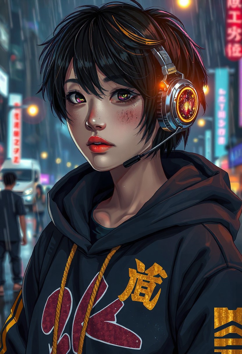 A 4K photorealistic picture of a Half-Japanese male hacker. More Caucasian with freckled nose and cheeks. Black hair with golden frosted tips. Aged 28. Cyberpunk clothing. Hi tech chrome and carbon fibre one eared headset. Bold graphic styled Hoodie with Japanese lettering down a sleeve and a bold golden stripe down each sleeve The girls eye pupils have swirling Galaxy of stars and specks floating in a nebula pattern Posed in front of a Rainy city at nite