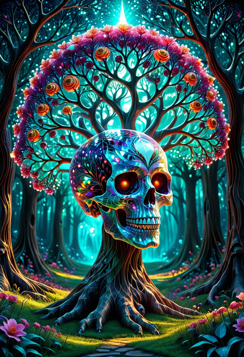 ,A beautiful flowering tree made out of fractangles, with skull shaped fruit, in a fairy glade, ethereal, glowing, magicNpolished, light, very detailed, amazing quality, intricate, cinematic light, highly detailed, Masterpiece, beautiful, surreal, dramatic,
