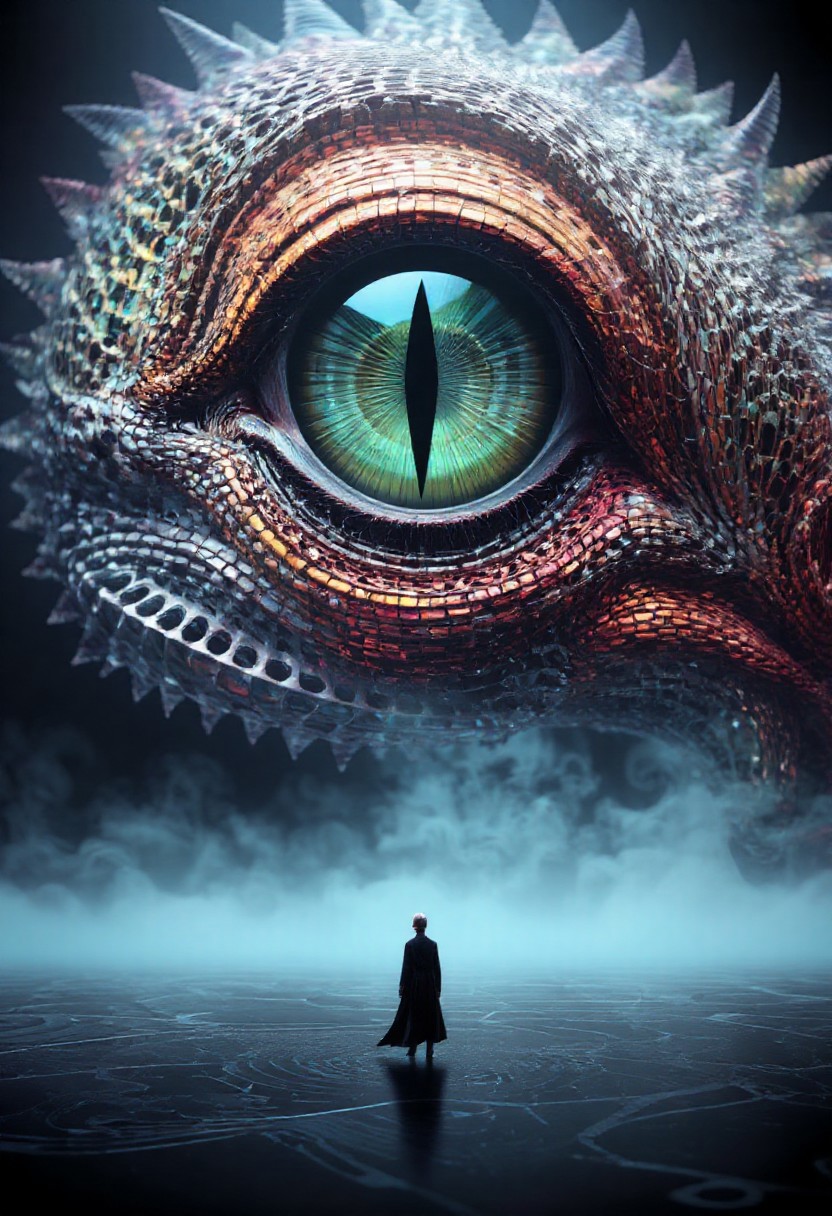 a striking and surreal scene that combines elements of both the natural world and fantasy. Dominating the composition is a massive, reptilian eye, filling almost the entire frame. The eye is highly detailed, with a slit-like pupil that suggests it belongs to a large, powerful creature, perhaps a dragon or another mythical being. The texture around the eye is rugged and scaly, giving the impression of ancient, weathered skin. In the lower portion of the image, a solitary human figure stands before the eye, dressed in a flowing black robe. The figure is tiny in comparison to the colossal eye, emphasizing the vast difference in scale and power between the two. The person stands on a surface that appears to be water or mist, which reflects the eerie, otherworldly light that surrounds the scene. The atmosphere is misty and dreamlike, adding to the sense of mystery and awe. Overall, the image is both dramatic and thought-provoking, blending cultural elements with a fantastical imagination to create a visually captivating scene. made out of fractangles, PG rating, sfw,