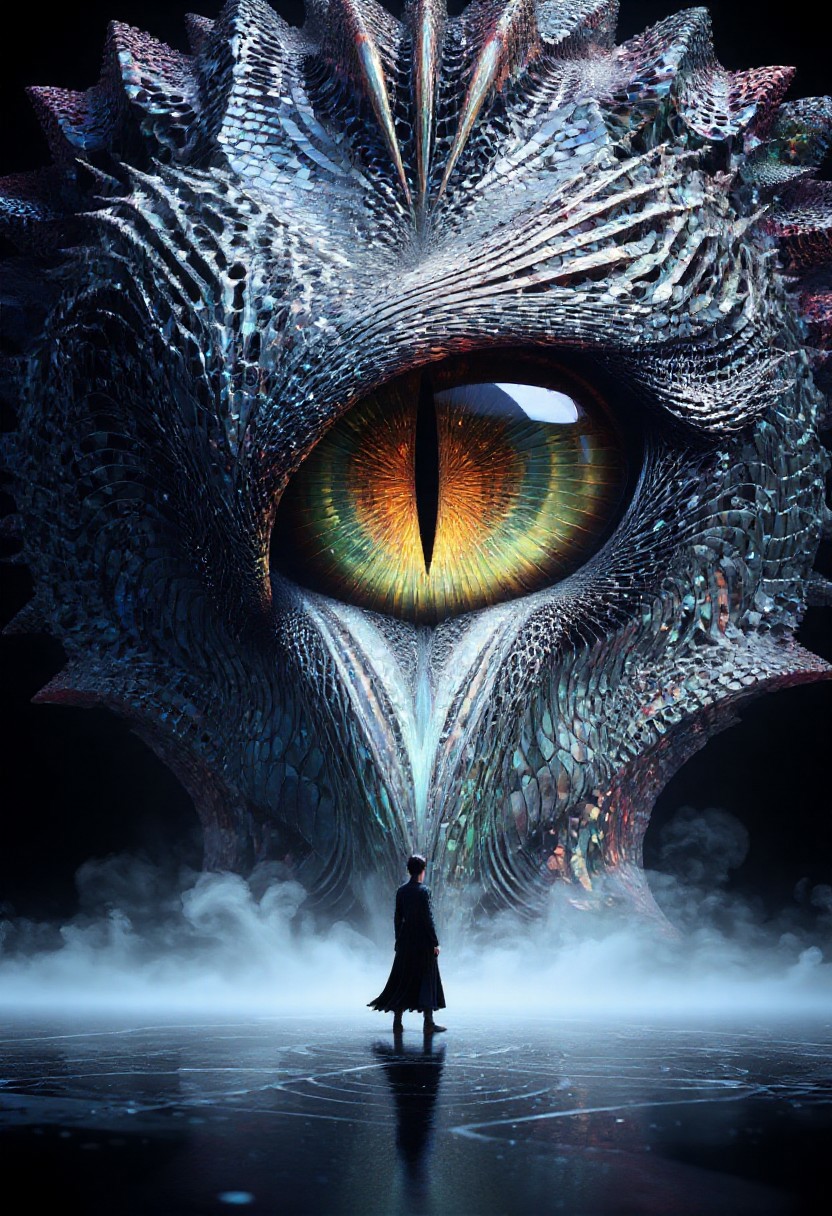a striking and surreal scene that combines elements of both the natural world and fantasy. Dominating the composition is a massive, reptilian eye, filling almost the entire frame. The eye is highly detailed, with a slit-like pupil that suggests it belongs to a large, powerful creature, perhaps a dragon or another mythical being. The texture around the eye is rugged and scaly, giving the impression of ancient, weathered skin. In the lower portion of the image, a solitary human figure stands before the eye, dressed in a flowing black robe. The figure is tiny in comparison to the colossal eye, emphasizing the vast difference in scale and power between the two. The person stands on a surface that appears to be water or mist, which reflects the eerie, otherworldly light that surrounds the scene. The atmosphere is misty and dreamlike, adding to the sense of mystery and awe. Overall, the image is both dramatic and thought-provoking, blending cultural elements with a fantastical imagination to create a visually captivating scene. made out of fractangles, PG rating, sfw,