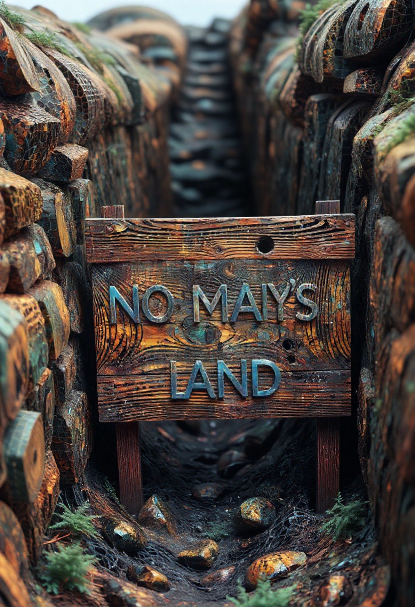 A World War II trench scene. A weathered wooden sign at the trench's entrance reads 'No Man's Land,' with bullet holes piercing through the letters. made out of fractangles, PG rating, sfw,