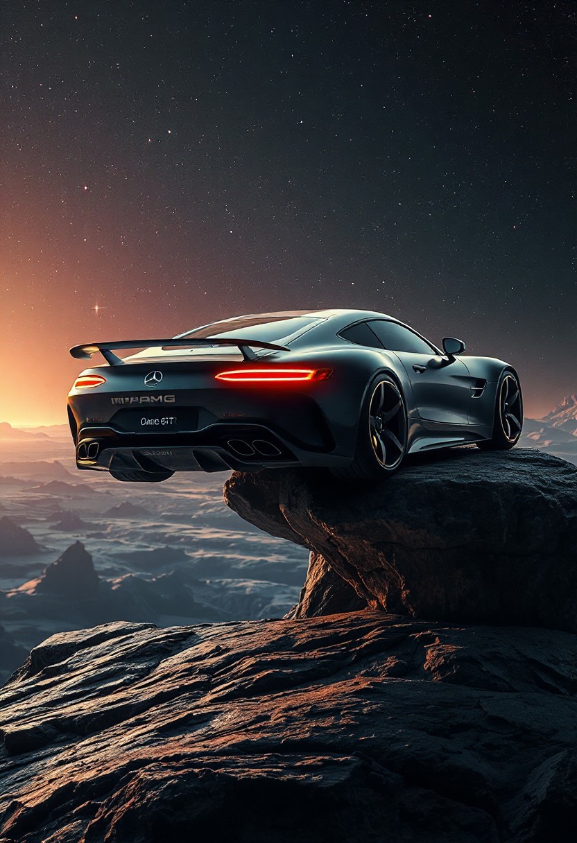 Mercedes-AMG ONE GT floating in outer space, ultra-realistic 4K render with high detail. The car has a pitch black and white color scheme, glowing red rear lights and neon blue front headlights. The car is levitating above a rugged asteroid, without contact to the surface. It is illuminated by distant stars, galaxies, and cosmic dust, casting subtle reflections on its sleek surface. Deep space lighting, realistic shadows, and a cinematic sci-fi atmosphere. The background features a cosmic environment with stars, nebulae, and distant celestial bodies. Emphasis on photorealism, weightless suspension, and dramatic lighting that enhances the futuristic vibe
