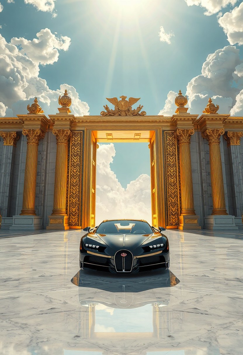 A hyper-realistic ultra luxury car (e.g., Bugatti La Voiture Noire or Rolls-Royce Sweptail) parked on polished white marble road, in front of massive golden gates of heaven, gates glowing with divine light, surrounded by soft white clouds, bright blue sky above, highly detailed reflections, god rays, cinematic lighting, 8K, ultra realistic