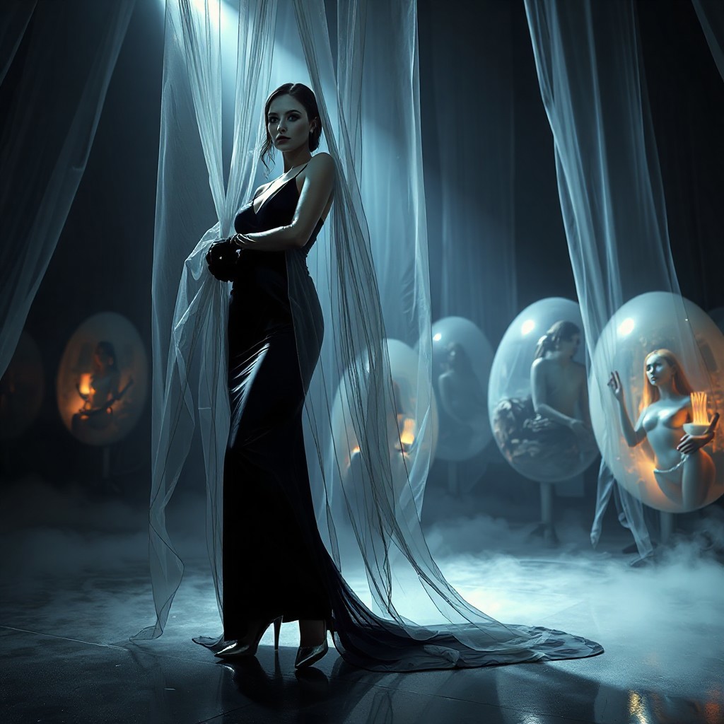 noble norvegian femme fatal lady posing standing wearing evening GLOSSY THIN black slime live tentacles gown, GLOVES and high heels, entrapped in giant long waving ultrathin transparent veils, surrounded by weird fog from the floor, captured in light beam from celling, giant slime covered transparent eggs with encased ladies at background, breeding chamber, ultrathin waisT, HORROR, reminiscent of H.R. Giger, Zdzisław Beksinski, and Ash Thorp's dark, sleek styles, with close-up glamour photography, glossy satin and silver heels glistening, fleshy slime dripping, and dark shadows.