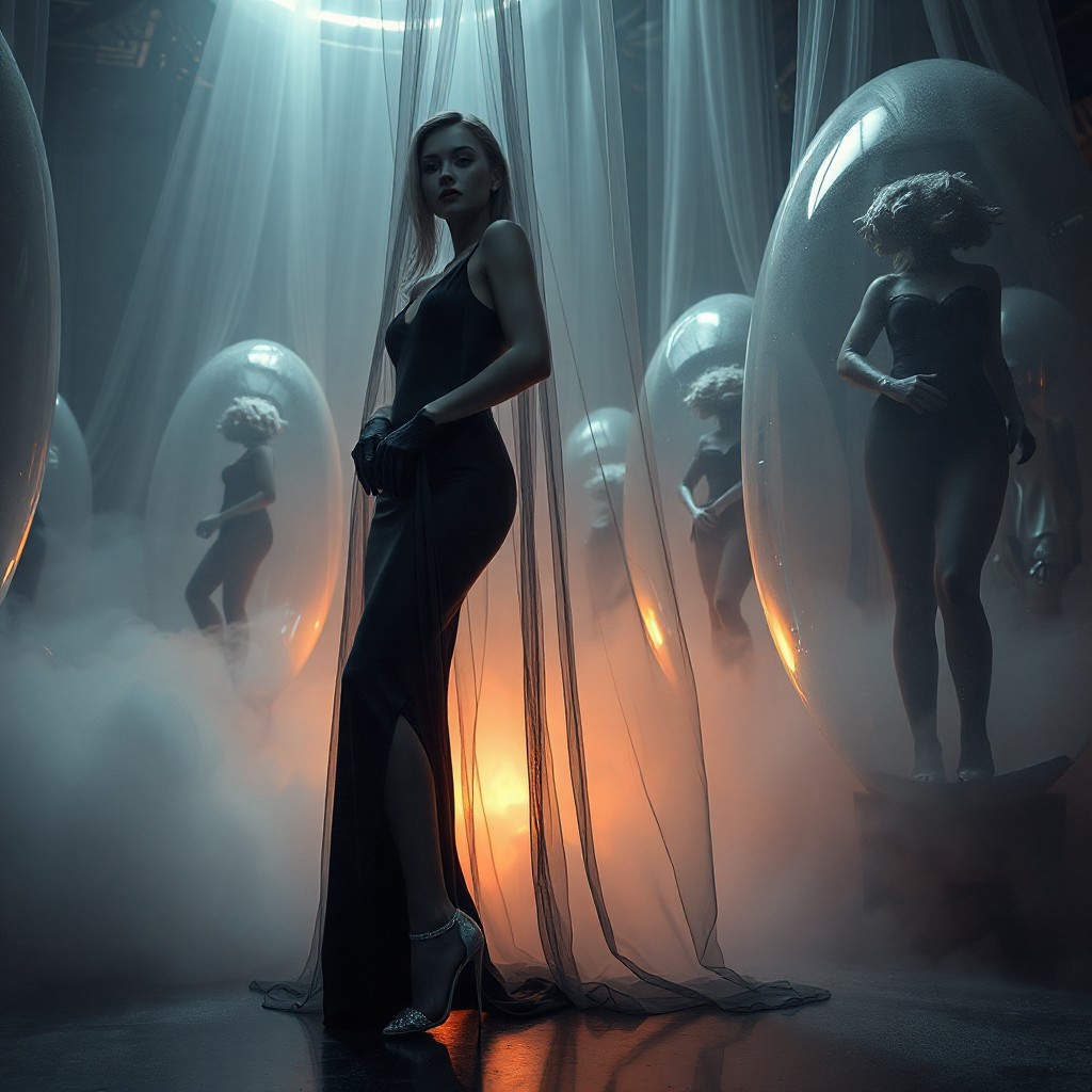 noble norvegian femme fatal lady posing standing wearing evening GLOSSY THIN black slime live tentacles gown, GLOVES and high heels, entrapped in giant long waving ultrathin transparent veils, surrounded by weird fog from the floor, captured in light beam from celling, giant slime covered transparent eggs with encased ladies at background, breeding chamber, ultrathin waisT, HORROR, reminiscent of H.R. Giger, Zdzisław Beksinski, and Ash Thorp's dark, sleek styles, with close-up glamour photography, glossy satin and silver heels glistening, fleshy slime dripping, and dark shadows.