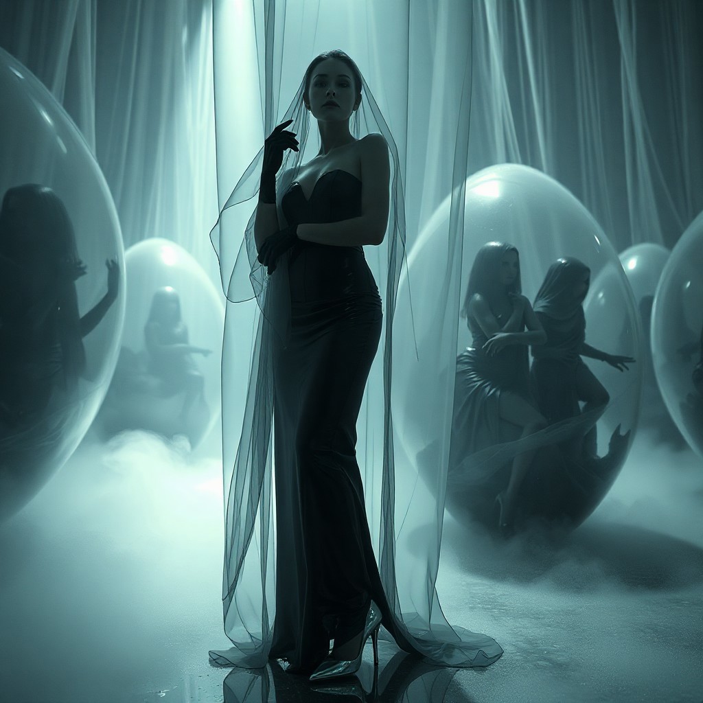noble norvegian femme fatal lady posing standing wearing evening GLOSSY THIN black slime live tentacles gown, GLOVES and high heels, entrapped in giant long waving ultrathin transparent veils, surrounded by weird fog from the floor, captured in light beam from celling, giant slime covered transparent eggs with encased ladies at background, breeding chamber, ultrathin waisT, HORROR, reminiscent of H.R. Giger, Zdzisław Beksinski, and Ash Thorp's dark, sleek styles, with close-up glamour photography, glossy satin and silver heels glistening, fleshy slime dripping, and dark shadows.