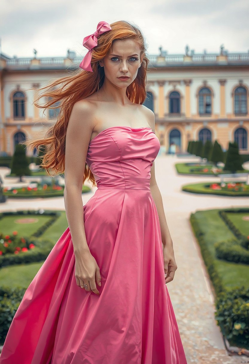 A high quality full body photo of a lithe tomboyish woman in her early twenties with long and flowing auburn hair and grey eyes. She is wearing a huge billowing pink long strapless dress and a bow in her hair matching her dress. She is scowling. The background shows a palace garden.