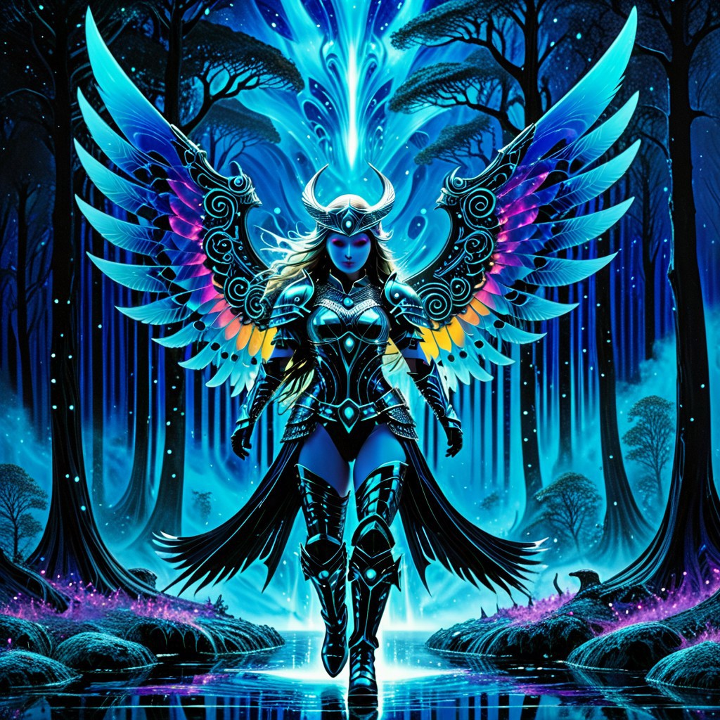Fractangles, made out of fractangles, Studio Ghibli Dark Fairytale, An abstract cyberpunk painting depicts a Valkyrie battle maiden hovering over a dark pond. The entire painting is rendered in vibrant phosphorescent blue violet hues against an inky black background. The Valkyrie wears full battle armor consisting of metal plates, greaves, chainmail, and boots. Her long flowing hair and spread wings blend into abstract forms with sharp neon contours and shimmering outlines. Her expressive glowing eyes are visible within her sculptural silhouette, which is highlighted by chiaroscuro lighting effects on her wings, armor, body, and hair. The background features blurred nocturnal landscape elements with smoky trees shrouded in fog and phosphorescent mist particles. The composition incorporates negative space with subtle fractals and a ghostly aura, executed in a cyberpunk neon style. painting technique using fluid brushstrokes and high contrast phosphorescent colors against dark backgrounds.