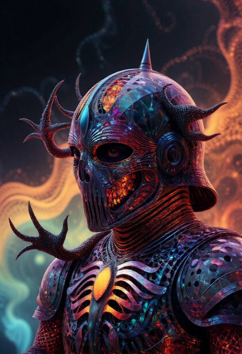 Masterpiece fantasy knight of legend with black armor, made out of fractangles, a helmet filled With Bones, Burning thunder storm, arms crawling oput of helmet. 2000s vintage RAW photo, photorealistic, film grain, candid camera, color graded cinematic, eye catchlights, atmospheric lighting, natural, shallow dof, High level of detail to create a photographic-like image, focusing on lighting, realistic textures, hyperdetailed. <lora:Fractangles - Flux_epoch_20:1>
