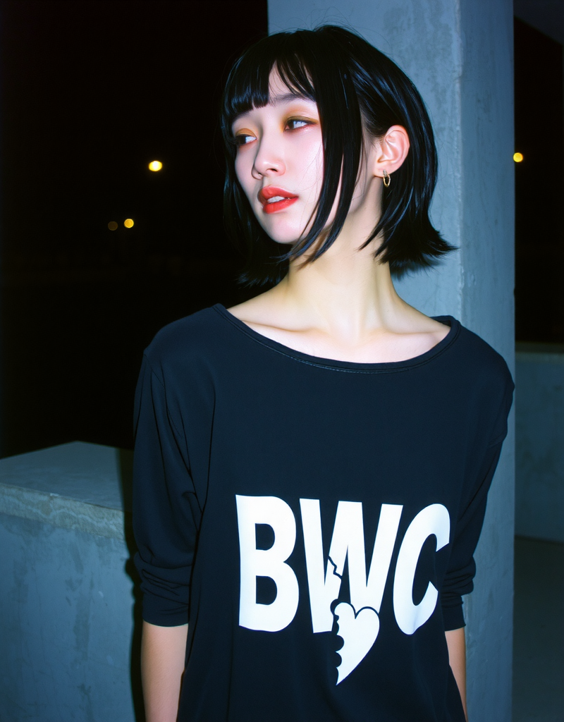 korean woman with very pale skin and black hair and wearing goth dress with the word "BWC" and a broken heart stamped on it in bold white letters and wearing no makeup and no lipstick, looking away, outdoors at night, leaning against concrete wall, candid photo, analog photography with film grain