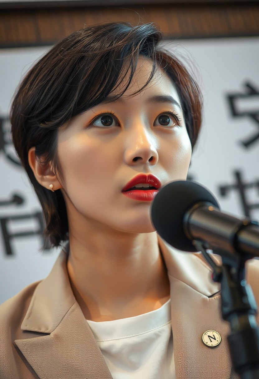 DSLR-style, elegant 26-year-old Korean model, dark eyes, extremely milky white skin with porcelain glow, smooth and luminous, flawless soft matte finish with light reflecting quality, Korean idol skin tone, subtle gradient from center to jawline, extremely pale white skin, parted lips, masterpiece, ultra high-resolution A close-up, eye-level shot captures a person with short, dark hair speaking into a microphone. They are dressed in a light-colored blazer over a white top, with a small metallic emblem visible on the lapel. Their mouth is slightly open as if in mid-sentence, and their gaze appears to be directed slightly upwards and to the right, suggesting they are addressing an audience or looking at a screen. The background is softly blurred, showing hints of a white wall with dark lettering, implying an indoor setting like a press conference or official meeting. The lighting is bright and even, highlighting their features.