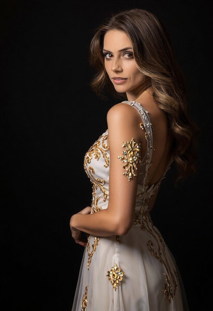 portrait of a woman in a white sheer gown with gold embroidery, wavy light brown hair cascading over her shoulders, posed against a dark background for a luxurious and glamorous feel. Paramount Lighting