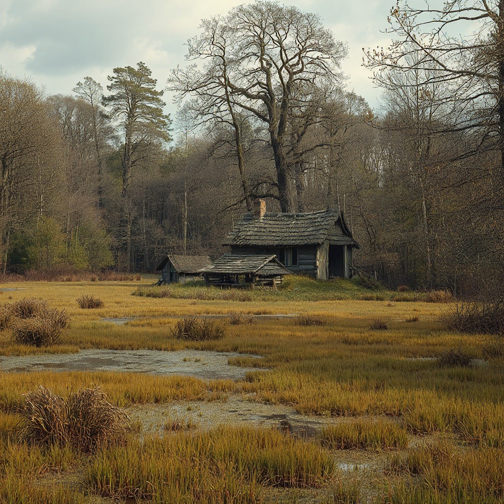 8k, source_photo, source_real, traditional media, amateur, real life photo, broad swamp and marsh, clumps of woodland, abandoned hut, dungeons and dragons, medieval