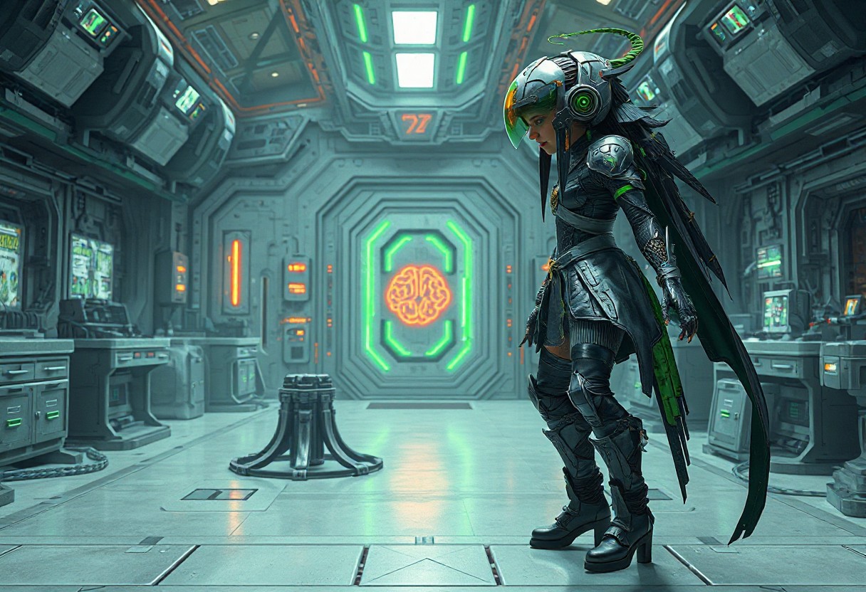 Binary Sorceress, cinematic, cyber metal stand, brain research lab, gray & green, red/yellow emblem, visor helmet, black boots, dynamic pose, right-facing, detailed face, intricate clothes, octane render, unreal engine 5, Artstation trending, vivid emotions, joyful, powerful message, beautiful detailed eyes, CGSociety, Golden Ratio, ultra detailed isometric landscape by nekroxiii, ominous elaborate abstract surrealism, symmetrical, ruins, airbrush, intricately detailed.