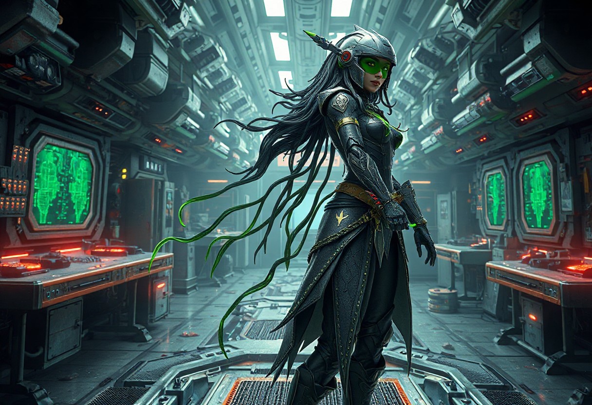 Binary Sorceress, cinematic, cyber metal stand, brain research lab, gray & green, red/yellow emblem, visor helmet, black boots, dynamic pose, right-facing, detailed face, intricate clothes, octane render, unreal engine 5, Artstation trending, vivid emotions, joyful, powerful message, beautiful detailed eyes, CGSociety, Golden Ratio, ultra detailed isometric landscape by nekroxiii, ominous elaborate abstract surrealism, symmetrical, ruins, airbrush, intricately detailed.