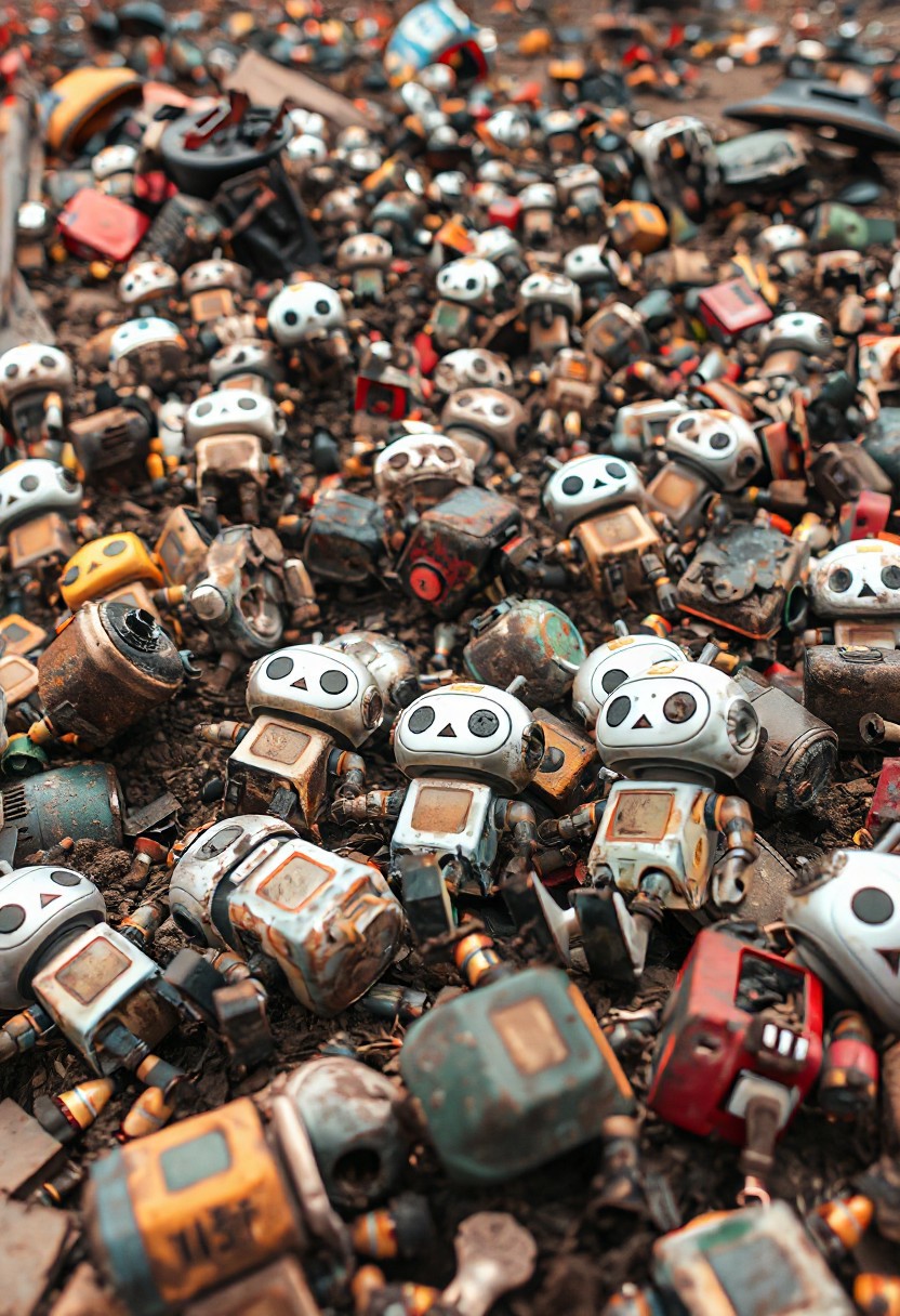 Many little cute robots laying scattered in a junkyard. Some of them are severely broken and beyond recognition.