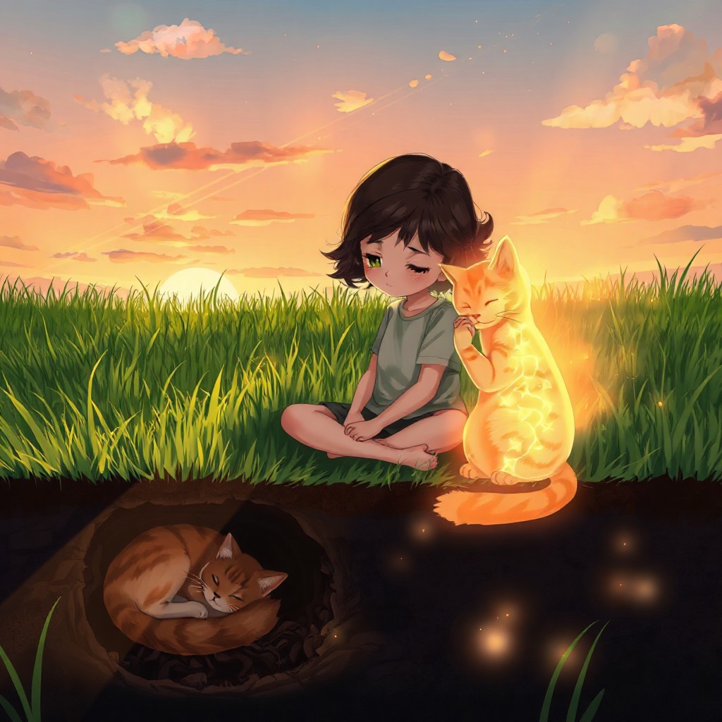A heartfelt, semi-realistic digital illustration of a young girl sitting cross-legged on the ground in a lush, verdant grassy field under a serene, golden-hour sky with hues of amber and soft pink, her head in her hands, eyes closed, with a gentle, melancholic expression and subtle tears glistening, reflecting quiet sorrow and love. Below the surface, a deeper, darker cutaway view reveals a beloved cat, curled up peacefully in rich, shadowy soil, surrounded by deep earth tones of dark umber and black, with thick roots weaving densely around it, symbolizing eternal rest. Next to the girl, the glowing, ethereal spirit of the same cat sits upright, its translucent form radiating a warm, golden light that shimmers like fireflies, lovingly rubbing its head against the girl's shoulder in a tender, comforting gesture, with soft, defined fur patterns glowing faintly. The scene is enveloped in a dreamy, nostalgic atmosphere, with delicate light rays filtering through scattered clouds, casting a gentle glow on the grass and the girl's serene face. The artwork features vibrant yet tender colors, with intricate textures in the grass blades, soil layers, and the cat's fur, emphasizing a profound emotional connection between the girl and the cat's spirit, evoking themes of love, loss, and enduring memory.