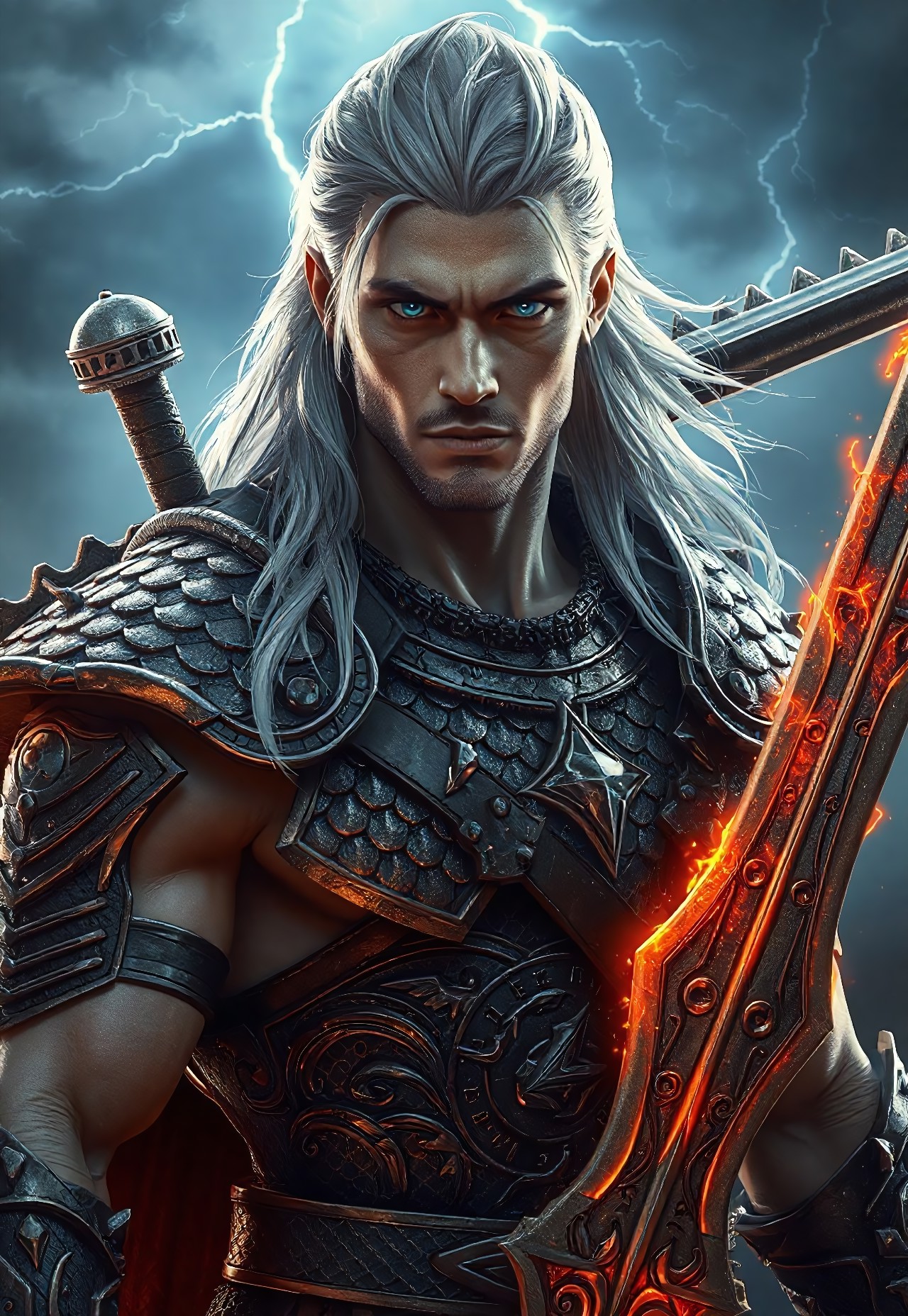 A breathtakingly handsome male warrior with a chiseled jawline, piercing sapphire blue eyes, and long flowing silver hair, adorned in intricate dragon-scale armor with glowing runes, standing atop a stormy battlefield with lightning striking behind him, his muscular frame exuding raw power and regal charisma, highly detailed facial expression with a fierce yet noble gaze, dynamic pose with a massive flaming greatsword resting on his shoulder, ultra-realistic, hyper-detailed skin textures, cinematic god-ray lighting, dramatic atmosphere, 8K UHD, by Artgerm, Greg Rutkowski, and WLOP, Unreal Engine 5 render