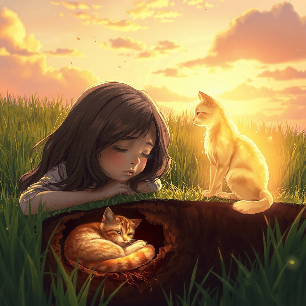 A heartfelt, semi-realistic digital illustration capturing a poignant moment in a lush, verdant grassy field under a serene, golden-hour sky with hues of amber and soft pink. A young girl, with flowing hair and a delicate, melancholic expression, lies on her stomach, her ear gently pressed to the cool, dew-kissed ground, eyes closed as if listening to a distant memory. Her face reflects quiet sorrow and love, with subtle tears glistening at the corners of her eyes. Below the surface, a detailed cutaway view reveals a beloved cat, curled up peacefully in rich, loamy soil, surrounded by warm earth tones of umber and sienna, with faint roots weaving around it, symbolizing eternal rest. (((Next to the girl, the glowing, ethereal spirit of the same cat sits upright, its translucent form radiating a warm, golden light that shimmers like fireflies, lovingly rubbing its head against the girl's shoulder in a tender, comforting gesture. The cat's spirit has soft, defined fur patterns glowing faintly, mirroring its earthly form))). The scene is enveloped in a dreamy, nostalgic atmosphere, with delicate light rays filtering through scattered clouds, casting a gentle glow on the grass and the girl's serene face. The artwork features vibrant yet tender colors, with intricate textures in the grass blades, soil layers, and the cat's fur, emphasizing a profound emotional connection between the girl and the cat's spirit, evoking themes of love, loss, and enduring memory.