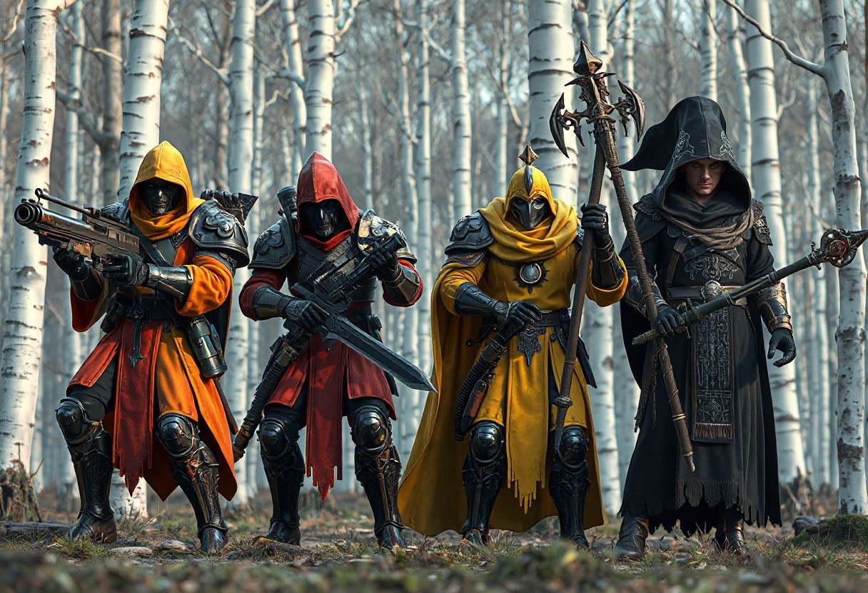Four action Gravekeepers (orange/black Cannonholder with gun & sword, red Visionary, yellow Nobleman, black Shaman with cape) line up against stark White Forest poplars. Meticulously detailed armor, weapons, dynamic action poses. 4K, matte painting, splash ink, octane render, Unreal Engine 5, Raphael & Houdini styles. Vivid emotions, beautiful detailed eyes, Artstation, CGSociety, Mark Brooks, Brad Kunkle, Alena Aenami style, colorful textured brushstrokes, soft illumination, golden ratio.