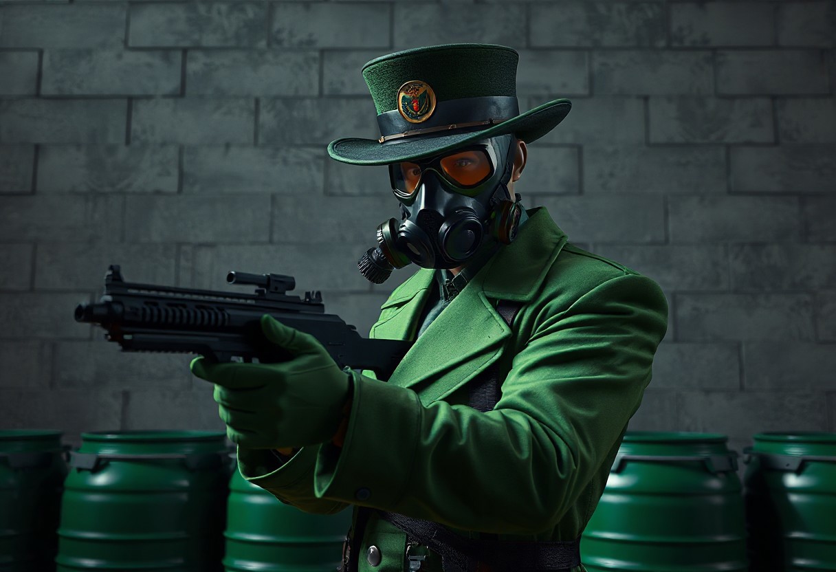 Nightmare Magician, green uniform, black cap, concrete wall backdrop, gas mask, green barrels. Armed, black gun, poised. Cinematic, volumetric lighting, dramatic composition, trending on Artstation, Unreal Engine 5, octane render, hyperdetailed, intricate, vibrant colors, masterpiece.