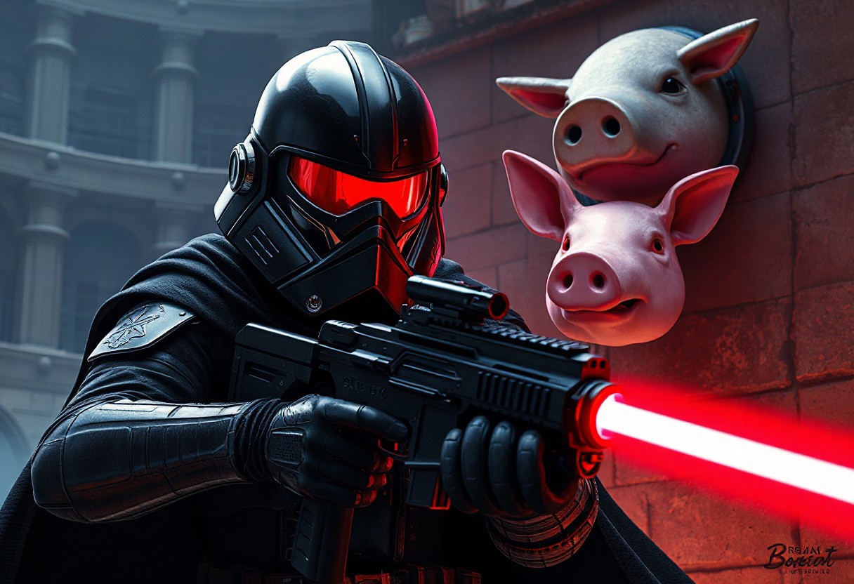 Star Wars bounty hunter, "Golgoil the Steel Seismic Smasher", Colosseum-Cage backdrop, black helmet, red visor, black cape, blaster rifle, dynamic action pose. Pink pig's head mounted on wall. Cinematic, dramatic lighting, Octane Render, Unreal Engine 5 pro, Raphael style, splash ink illustration, CGSociety, trending on ArtstationHQ, golden ratio. 4k, hyperdetailed face, vivid colors, matte painting, impeccable composition, attractive background, balanced editing.