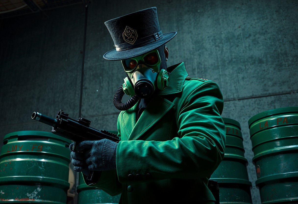 Nightmare Magician, green uniform, black cap, concrete wall backdrop, gas mask, green barrels. Armed, black gun, poised. Cinematic, volumetric lighting, dramatic composition, trending on Artstation, Unreal Engine 5, octane render, hyperdetailed, intricate, vibrant colors, masterpiece.