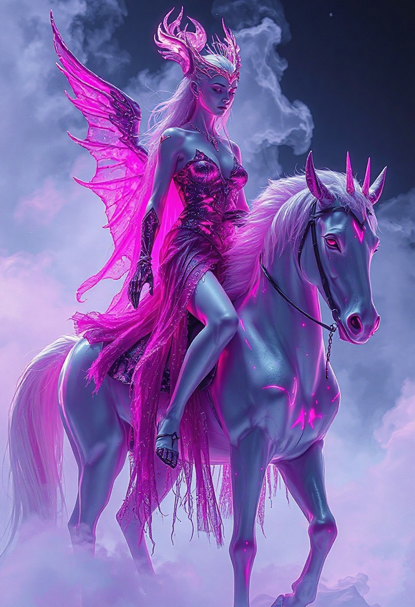 toxic skin art style, Laevateinn with neon lava-magenta galaxy black and white color palette Skin archaea/woman, Bioluminescence translucent background, full view, hyper realistic, masterpiece, 32k, detailed, full body view, female ,Big legs, wide hips, a the woman wearing shattered glass like robe, woman is riding a Laevateinn with pearl-white magenta galaxy black and white color palette Skin,