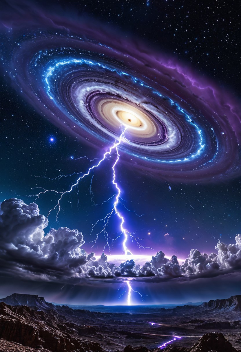 lightning storm, Saturn, low angle, planet prominent, universe background, intricate details, hyperdetailed, HDR, cinematic lighting, cinematic composition, rim lighting, intense, color grading, focused, whole scene, cosmic, storm clouds, electric blue, violet, white lightning, rings of Saturn, nebulae, starfield, cinematic atmosphere