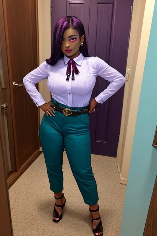 PSEStheno, makeup, magenta_eyeshadow, hair_over_one_eye, yellow_eyes, slit_pupil, purple_hair, SthenoPoshOutfit, red_gem_brooch, white_collared_shirt, teal_neck_ribbon, teal_pants, black_belt, big_gold_belt_buckle, jewelry, long_sleeves, heeled sandals, sandals, full body, standing, solo