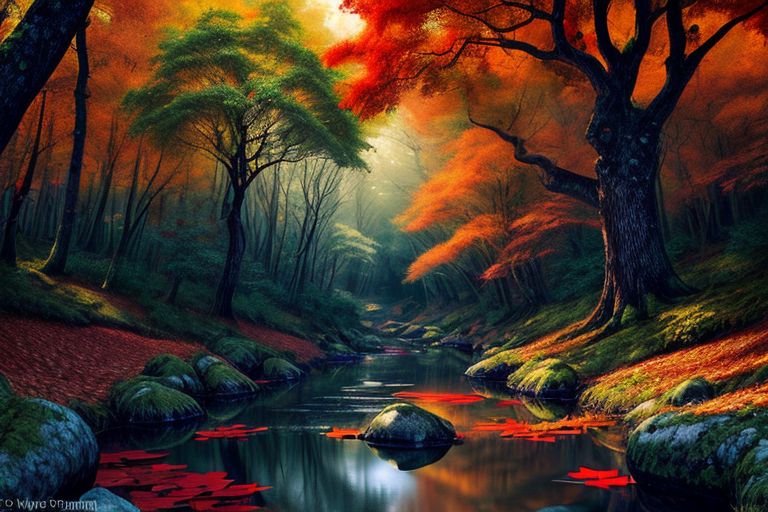 Whispers of Autumn's Elegance: As the year meanders gently towards its twilight, the forest adorns itself in a cloak of vibrant hues, a testament to nature's quiet celebration of time's passage. Leaves, painted in fiery shades of crimson, gold, and amber, cascade softly onto the forest floor, creating a tapestry rich in color and texture. The air is crisp, carrying with it the subtle fragrance of pine and the earthy scent of decayed leaves, a reminder of life's perpetual cycle of renewal. In the heart of the forest, a solitary, ancient oak stands majestically, its branches stretched out like the fingers of a wise sage, inviting the weary to find solace underneath its expansive canopy. A gentle stream, its waters clear and melodious, winds its way through this vibrant landscape, stones and pebbles lining its bed like jewels forgotten by time. No creatures stir in this moment; all is still save for the whispering wind, creating a scene of serene isolation, an ode to the sublime beauty of the ephemeral. #forest #autumn #leaves #stream #ancient_oak #vibrant_colors #serenity #isolation