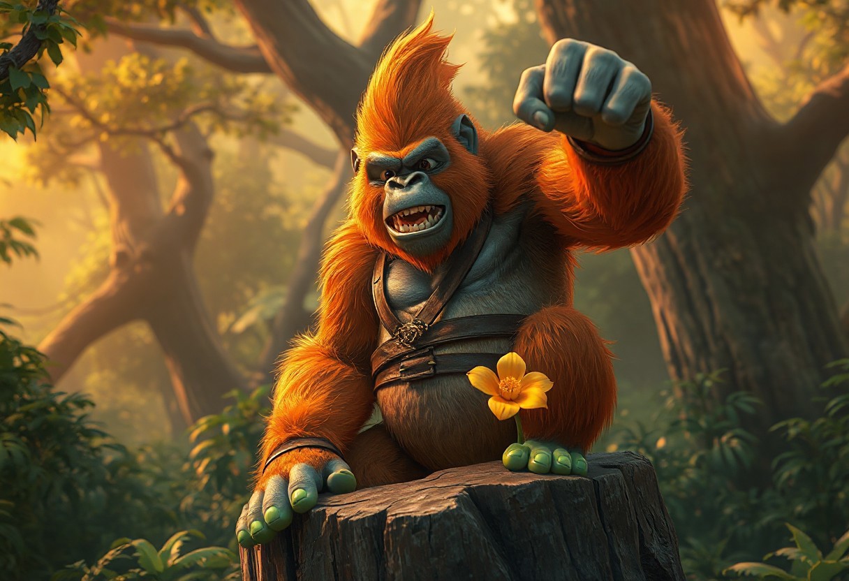 Fiery Gorilla, Brotherhood of the Fist, verdant forest. Orange fur, brown belt, yellow flower, green feet. Tree stump throne, dense foliage. Cinematic, Raphael style, splash ink illustration, dynamic action pose, octane render, Unreal Engine 5. Vivid emotions, joyful impact, golden ratio. Trending on Artstation, CGSociety. Beautiful detailed eyes, 4k, high-res, handcrafted precision, matte painting, grammer effect, isometric view, captivating lighting.