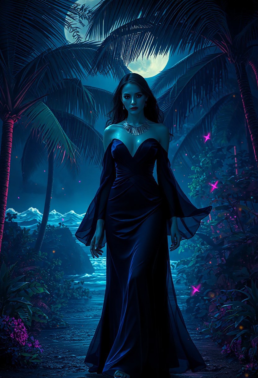 Cinematic Concept Art. A mysterious woman walks through a neon-lit tropical jungle at midnight. She wears a deep indigo haute couture dress with flowing sleeves and a silver necklace glowing in the moonlight. The cinematic concept art style uses dramatic chiaroscuro lighting, volumetric glow from palm trees, and colorful fireflies floating around her. The background features shimmering ocean waves and glowing foliage, blending cyberpunk neon with lush nature. Low poly accents enhance the digital aesthetic.