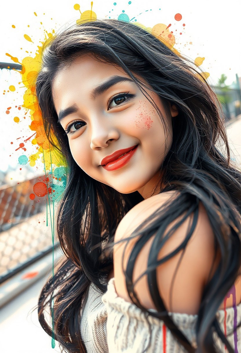A vibrant and artistic watercolor illustration of a cool girl(A close-up, eye-level shot captures a young individual with long, dark, wavy hair, parted casually and framing a softly smiling face. Their head is tilted slightly, and their gaze is directed towards the viewer, creating an inviting and warm expression. The individual is wearing an off-the-shoulder top in a neutral, textured fabric, suggesting a comfortable and relaxed style. The natural light highlights their features, with a soft glow on their skin. In the blurred background, hints of an urban or industrial setting are visible, including what appears to be a chain-link fence and some sparse foliage, adding a subtle contrast to the subject's soft presence. The overall impression is one of gentle beauty and approachability in a casual outdoor environment. ), facing slightly to the left, rendered in an explosion of bright, splashy colors. Its black and white feathers are softly defined, blending seamlessly into washes of yellow, orange, blue, and teal, with dynamic paint drips extending downwards, suggesting movement and fluidity. Numerous colorful splatters and dots surround the creature, enhancing the joyful and abstract aesthetic. The overall impression is one of playful creativity, combining natural elements with a touch of contemporary flair in a visually striking, high-resolution digital painting with a clean white background.