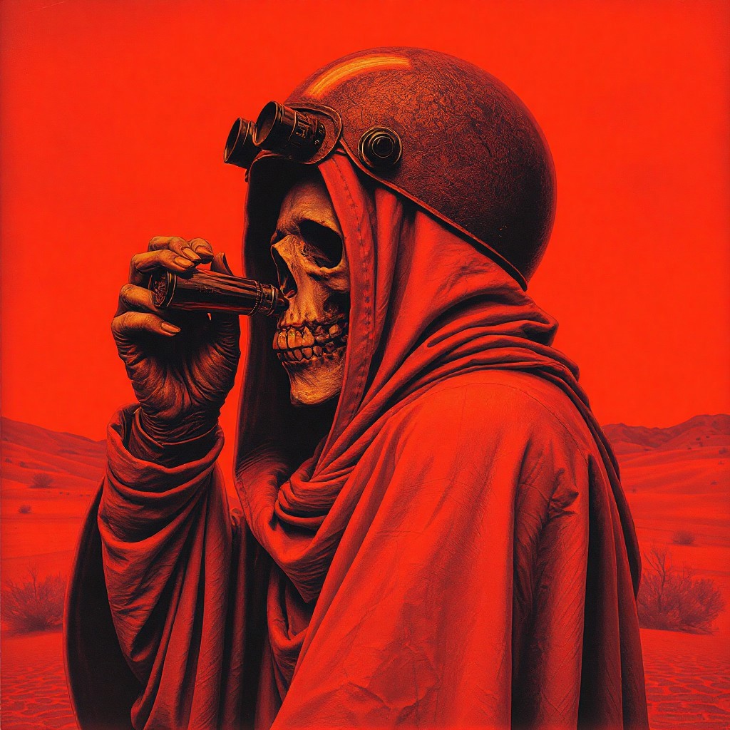 Dark art Side view of an cloaked ominous monk from the 70s-style pulp paintings drinking from the tubes on a beer helmet he is wearing while standing in a mysterious red desert, The sky is red and otherworldy. The monks grinning skeletal face is barely visible. Duotone: Burnt orange and deep plum. Mood: Occult ritual meets 80's crinkled concert poster art style. Grim reaper, doom metal-style, gritty, desert ritual, tales from the crypt