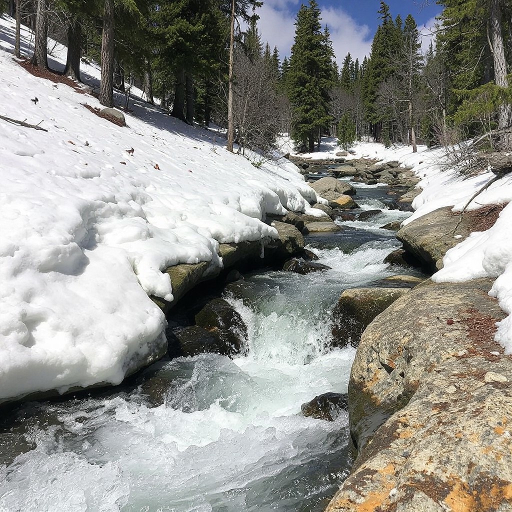 Spring melt, melting snow creates rapids down past the timberline, submerging half a foot of the trunks of evergreens, splashing off the rocks on the way down, 45 degree slope, birds take to the air, sunny, few clouds