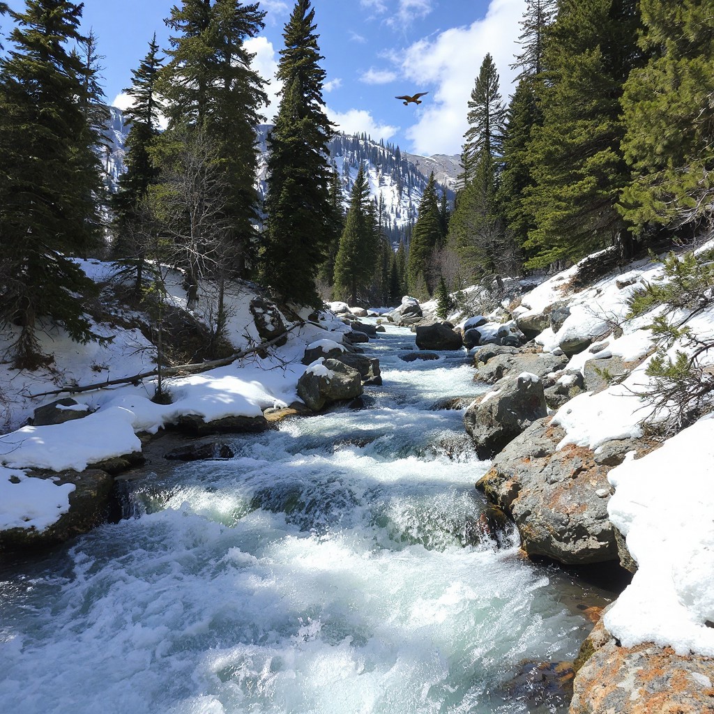 Spring melt, melting snow creates rapids down past the timberline, submerging half a foot of the trunks of evergreens, splashing off the rocks on the way down, 45 degree slope, birds take to the air, sunny, few clouds
