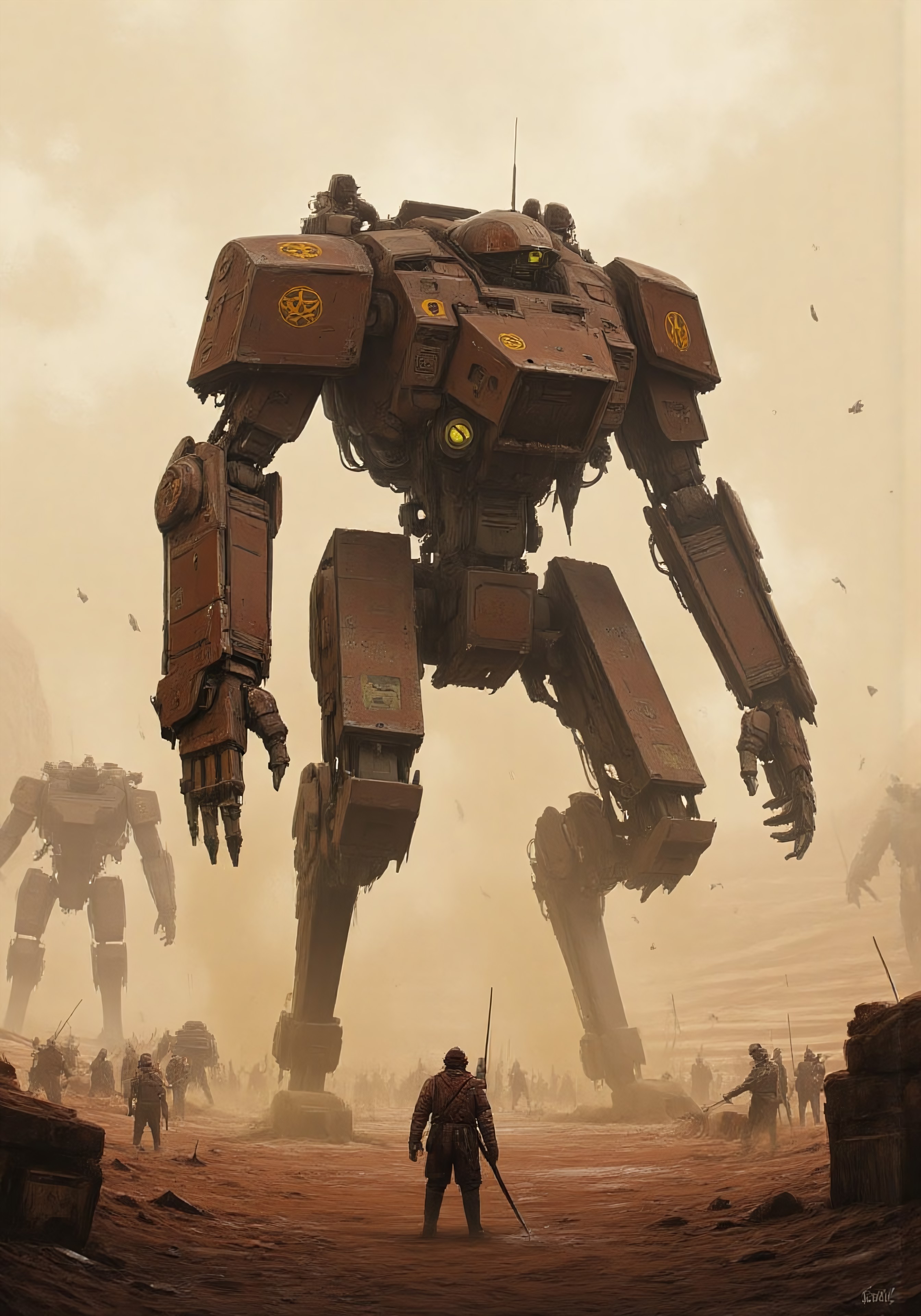 Brutalist Steampunk, gothic fantasy, moody lighting, rusted metal tones, ash and ember palette. Grimmdark, darktale, machanical, scattered golden runes and cybernectic line decorate. (Digital illustration, cinematic side-shot, ultra-realistic, grounded sci-fi realism, narrative composition, high cinematic atmosphere) In the dusty air of a Martian battlefield, the N-C-Brawler-04-T-G3 looms like a titan of myth, its 11-meter frame clad in Clan-grade Ferro-fibrous armor that gleams with a predatory sheen. Known as the “Iron Revenant,” this 100-ton Full Mech is the Terran Coalition’s ultimate close-combat weapon, designed to pulverize enemy Mechs and fortifications with unrelenting force. Powered by a 15 MW fusion reactor, its synthetic bio-mimetic muscles drive earth-shaking steps, while its plasma chainfist—a gauntlet wreathed in searing arcs—cleaves through steel like a blade through silk. In 2060, as interstellar wars rage across colonized worlds, the Brawler is both a symbol of dominance and a harbinger of destruction.
