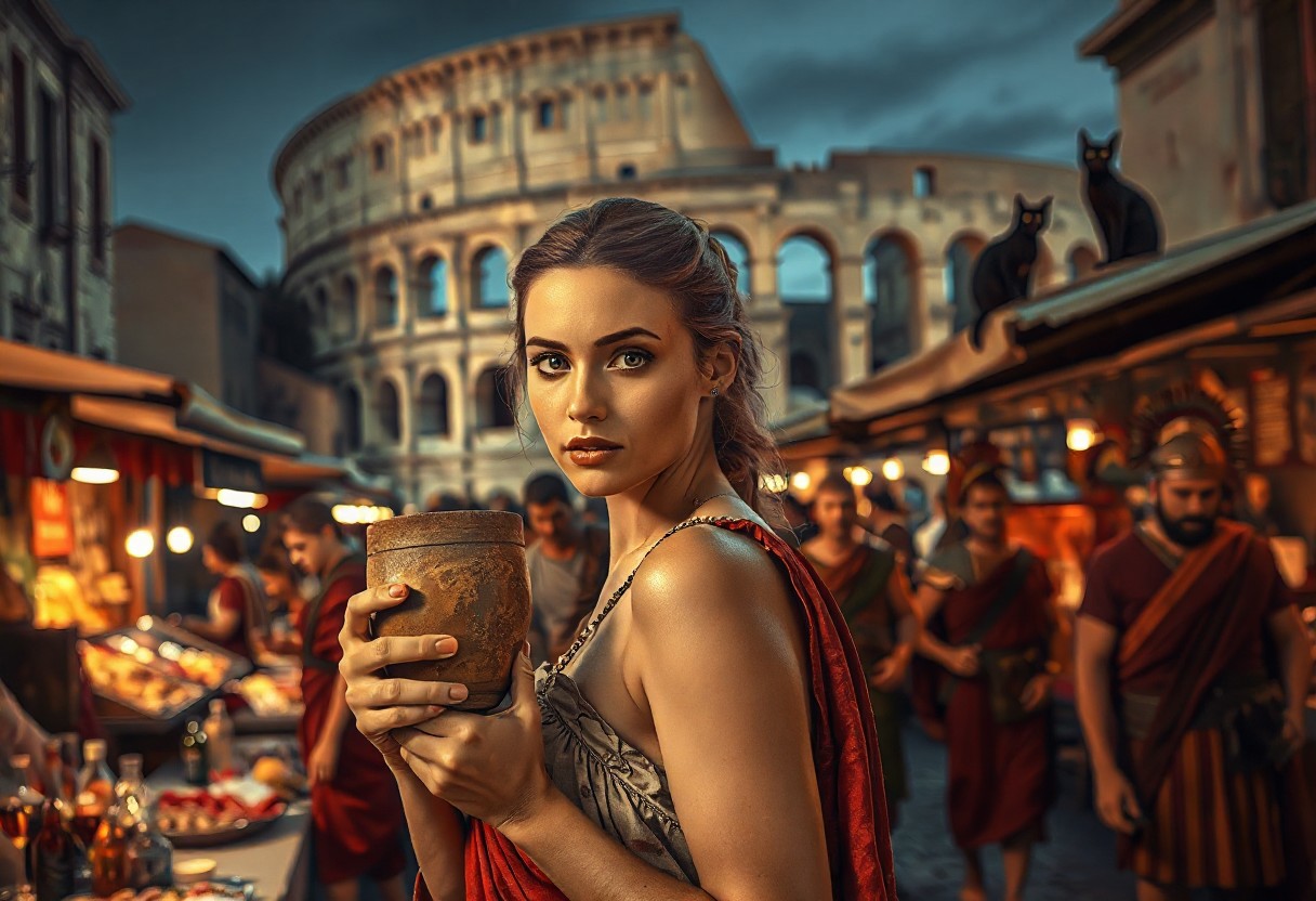 Setting is a 1st century Roman Empire market in Rome at night, the market is comprised of street vendors selling, food, weapons, and clothing. Everyone and everything in the image is appropriate for a scene from Ancient Rome, People wearing Roman clothing are walking through the street market shopping and eating, in the foreground is a merchant selling beverages and food at a market kiosk, (((a beautiful woman, 24 years old is standing in the foreground, the woman facing the viewer with a clay goblet of wine in her hand. Her eyes are beautiful and focused on the viewer, she has an expression of interested curiosity))), Roman Soldiers are walking behind the beautiful woman, one of the solders turns to look at the beautiful woman, many people are walking by in the busy street market, the woman is dressed in high fashion Roman Empire clothing with an alluringly sexual, but traditional roman aesthetic. The woman's hair is elegantly tied up with a ribbon. Artistic ancient Roman aesthetic, dynamic perspective, (((overall architectural aesthetic is Ancient Rome in 1st Century Roman Empire era))). Epic image that elicits a feeling of wonder and awe, Rome Coliseum Roman Forum architecture in background, a sleek black cat is visible sitting on a kiosk roof in the background,